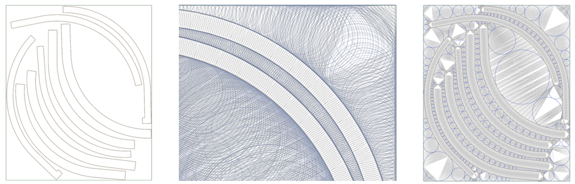 2. Finding the Circles: Once the space is defined, the program fills it with circles using a Delaunay triangulation. This ensures the circles cover as much space as possible. The level of detail can be adjusted, assuring a balance of speed and accuracy.