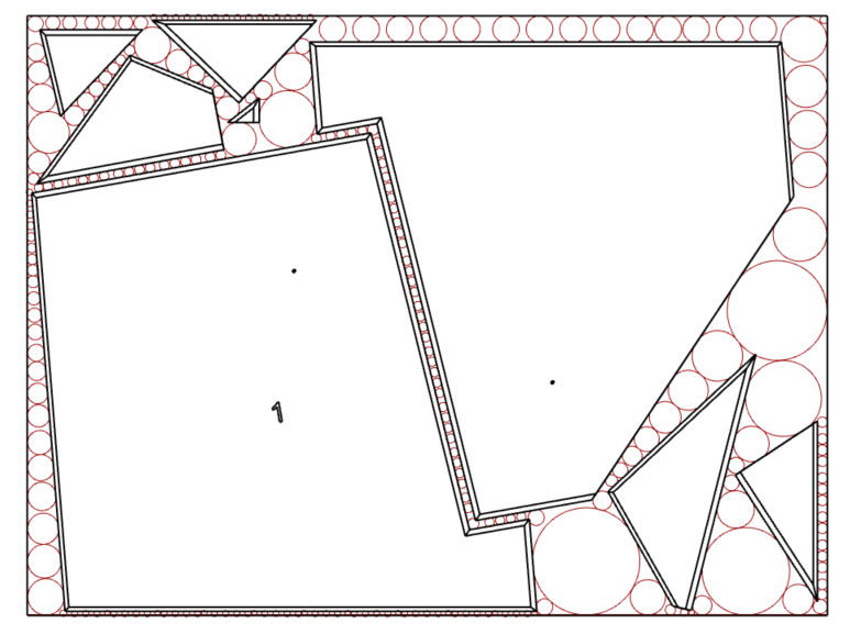 The script uses circle packing to find the largest circle that can fit into the leftover space. The idea is that a circle, because of its round shape, can cover the most area for a given amount of space around it. Circles are also an easy shape for quick spatial data analyses, as the radius and area can easily be extracted.